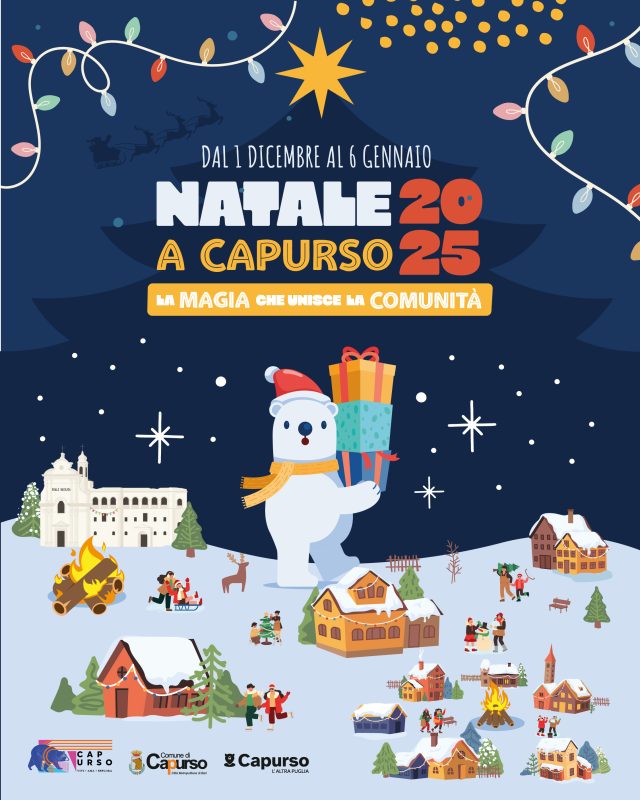 Sempre il 7 dicembre, un altro appuntamento speciale trasformerà il cuore di Capurso in un luogo magico: Borgo d’Incanto – concorso rivolto a tutti i cittadini, associazioni e scuole – che unisce luci, arte e artigianato in un percorso suggestivo tra presepi, suoni e sapori. Le iscrizioni sono aperte fino al 29 novembre al seguente link: https://www.comune.capurso.bari.it/novita/capurso-borgo-dincanto-2025/. L’iniziativa si svolgerà nei vicoli del centro storico, dove gli allestimenti dovranno essere pronti entro il 6 dicembre e resteranno visibili fino all’Epifania.